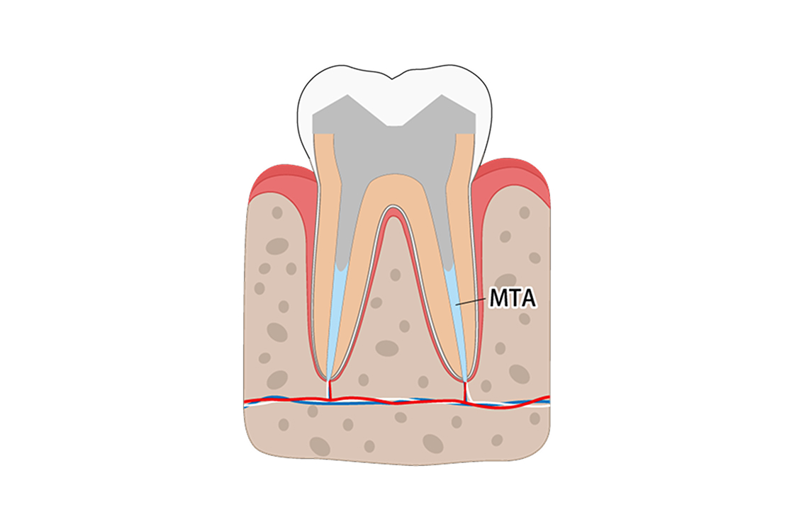 薬剤をすき間なく詰めるために、根管を広げて形を整えます。その後、薬を詰めて、細菌が侵入しないようにしっかりと密封します。