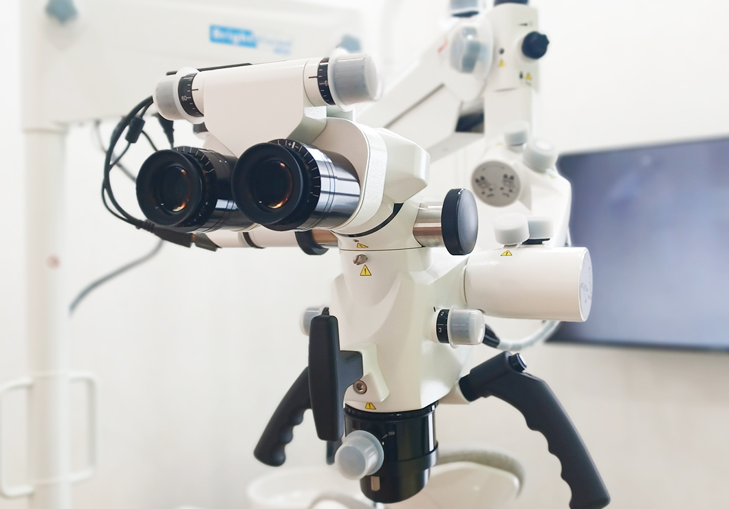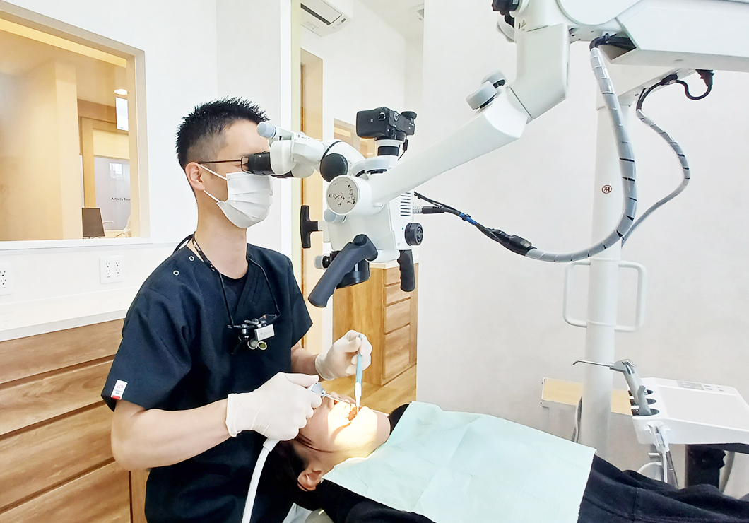 マイクロスコープは、患部を最大20倍に拡大できる歯科用の顕微鏡です。根管は直径1mmにも満たないので、肉眼で確認するのは非常に困難です。しかし、マイクロスコープを使えば、細部まで確認できるので、より精密に治療ができます。その結果、再治療のリスクを大幅に減らすことも可能になります。